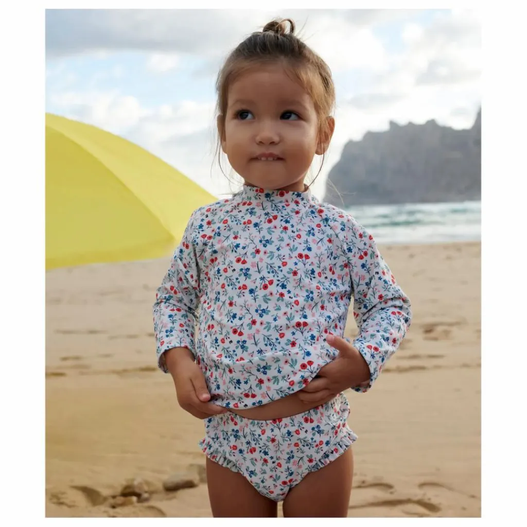 - T-shirt de bain à manches longues en polyamide pour fille avec col montant. On adore cet imprimé floral ! La norme UPF (ultra-violet protection factor) 50+ assure à cet article un haut niveau de protection contre les rayons UVA et UVB.C’est une affaire de famille : cet imprimé se retrouve sur d’autres pièces de la collection ainsi que pour les enfants !