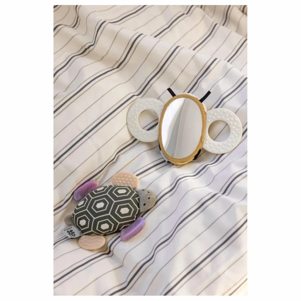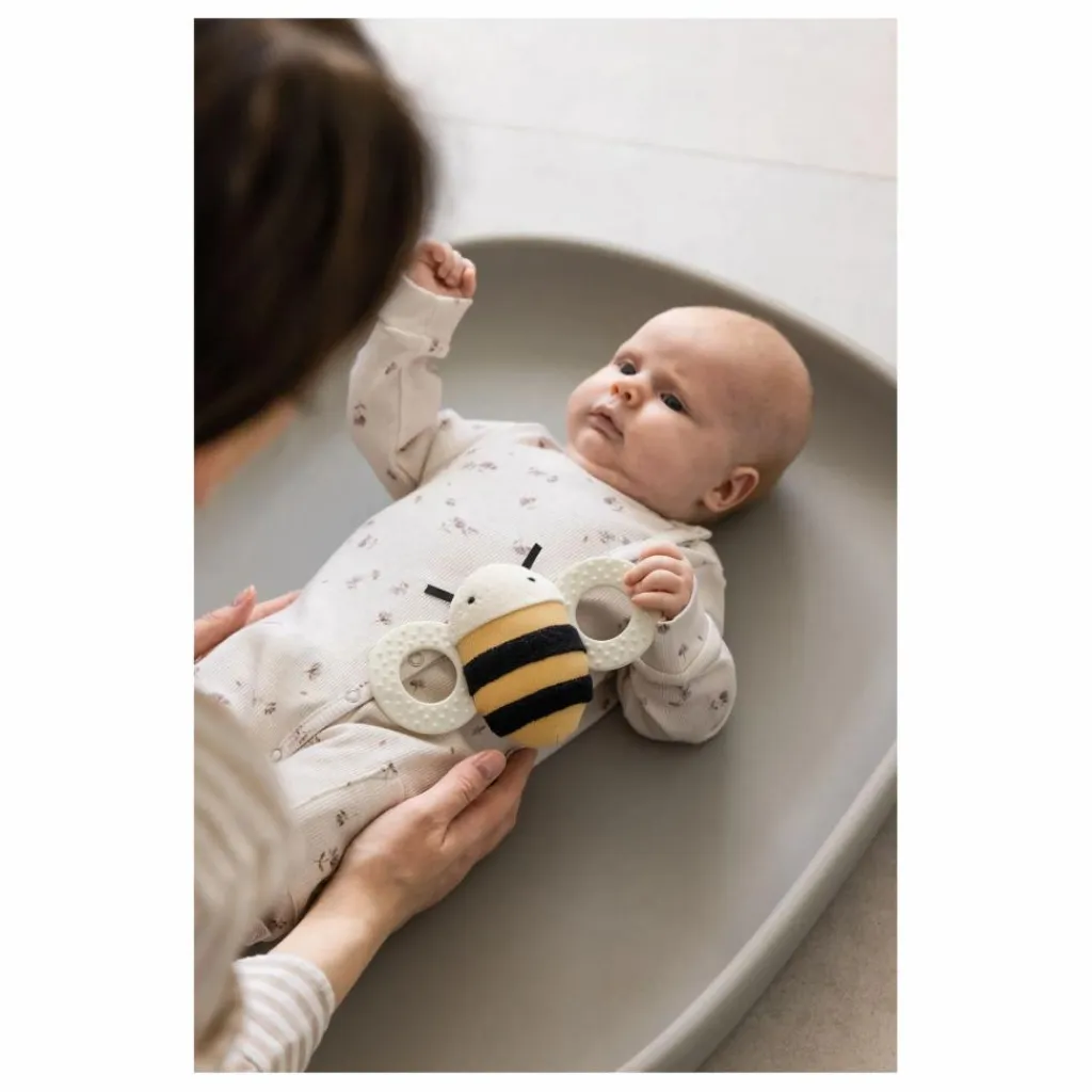 - 85% coton, 15% polyester – Rembourrage : Rembourrage : 100% polyester (recyclé) – Jouet d’éveil : 100% Silicone (TPE)