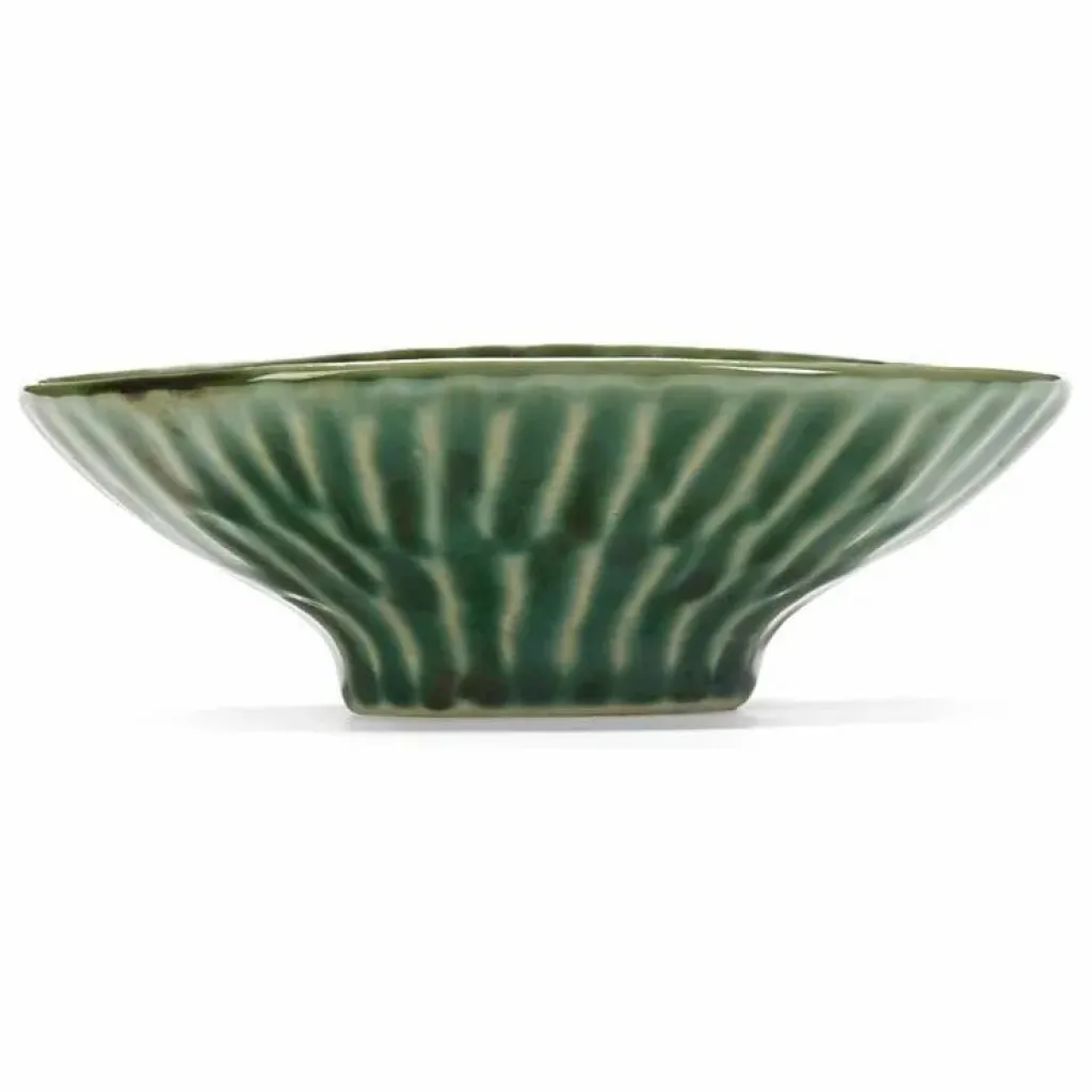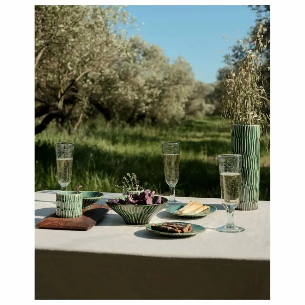 - Pour son dernier livre « Eén Pan », Naessens n’a pas seulement pris la plume, elle est aussi retournée dans son atelier de céramique. Elle a personnellement créé la collection « Verde Lanza », désormais produite en exclusivité par Serax. Le nom fait référence à l’île de Lanzarote, où Naessens réside souvent. Elle s’y est inspirée du vert des fenêtres et des portes en bois, ainsi que des rares plantes qui se détachent sur le paysage lunaire noir. Le vert délavé par le soleil – une teinte qui se marie à merveille avec tout ce qui est délicieux – est rehaussé par la texture en forme de coquillage que Naessens a appliquée avec ses doigts. En bref : cent pour cent Pascale et autant de soleil.