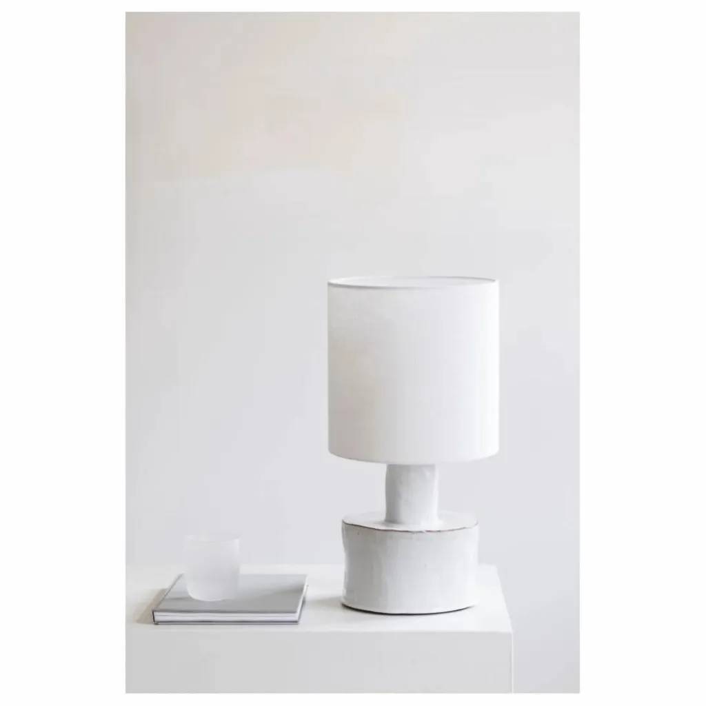 Cette jolie lampe est, pour Marie Michielssen, une source de chaleur et de confort. Même éteint, l’objet doit dégager quelque chose. Elle a donc choisi deux matériaux en fonction : la céramique pour le pied et le lin pour l’abat-jour.