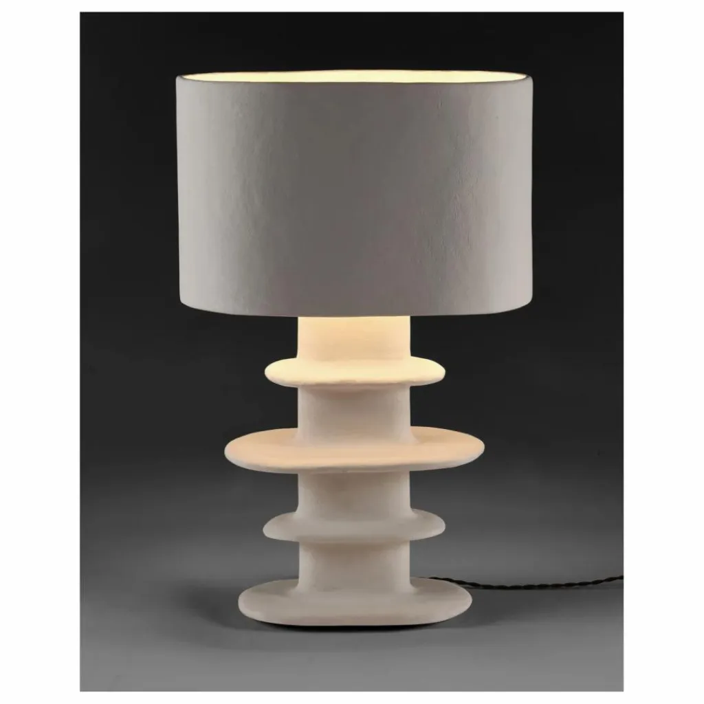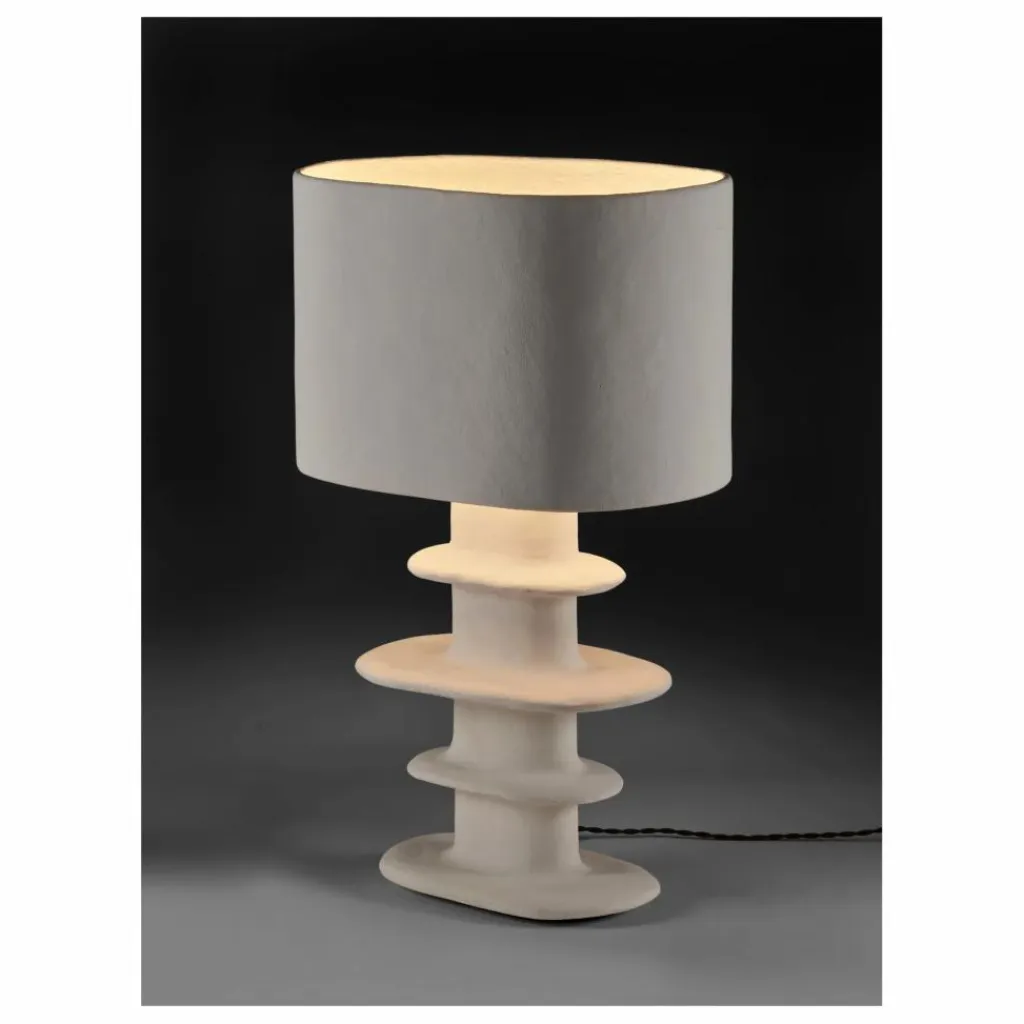 La lampe Earth édition 2024, plus grande que les modèles précédents, est entièrement réalisée en papier mâché. Son pied modelé à la main, qui rappelle les vases en céramique Billy sortis précédemment, capture la lumière d’une manière magique. La texture et la couleur du papier mâché confèrent toujours une touche artistique aux objets.