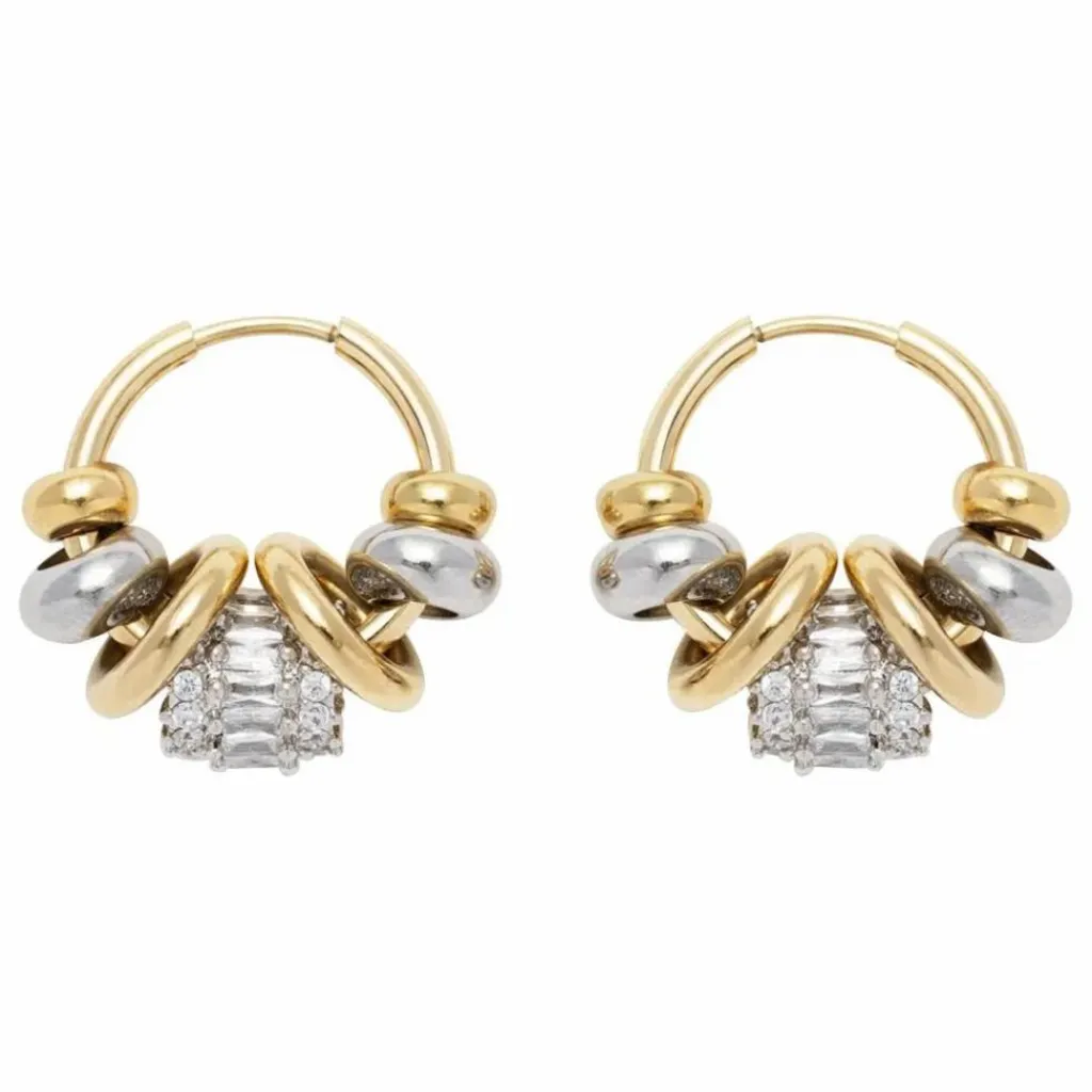 - Les boucles d’oreilles Luma présentent un anneau doré orné de perles argentées et dorées, ponctué d’un anneau central serti de pierres claires.