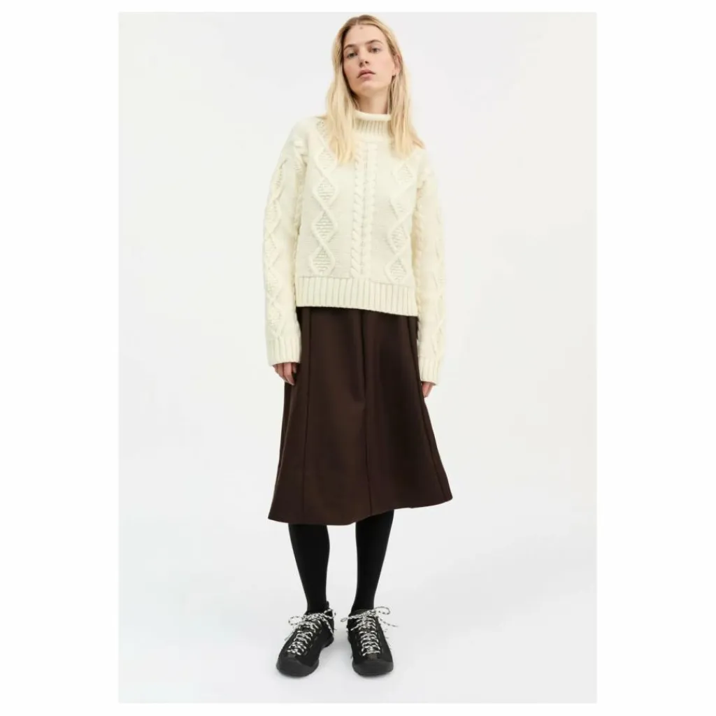 - Le White Sun O-neck Jumper est un pull à épaules tombantes qui présente un mélange de câbles, de tricot perlé et de détails Aran sur le corps et les manches. Des côtes épaisses sont utilisées pour créer un col montant avec un bord roulé et finissent l’ourlet et les poignets – Produit en Italie