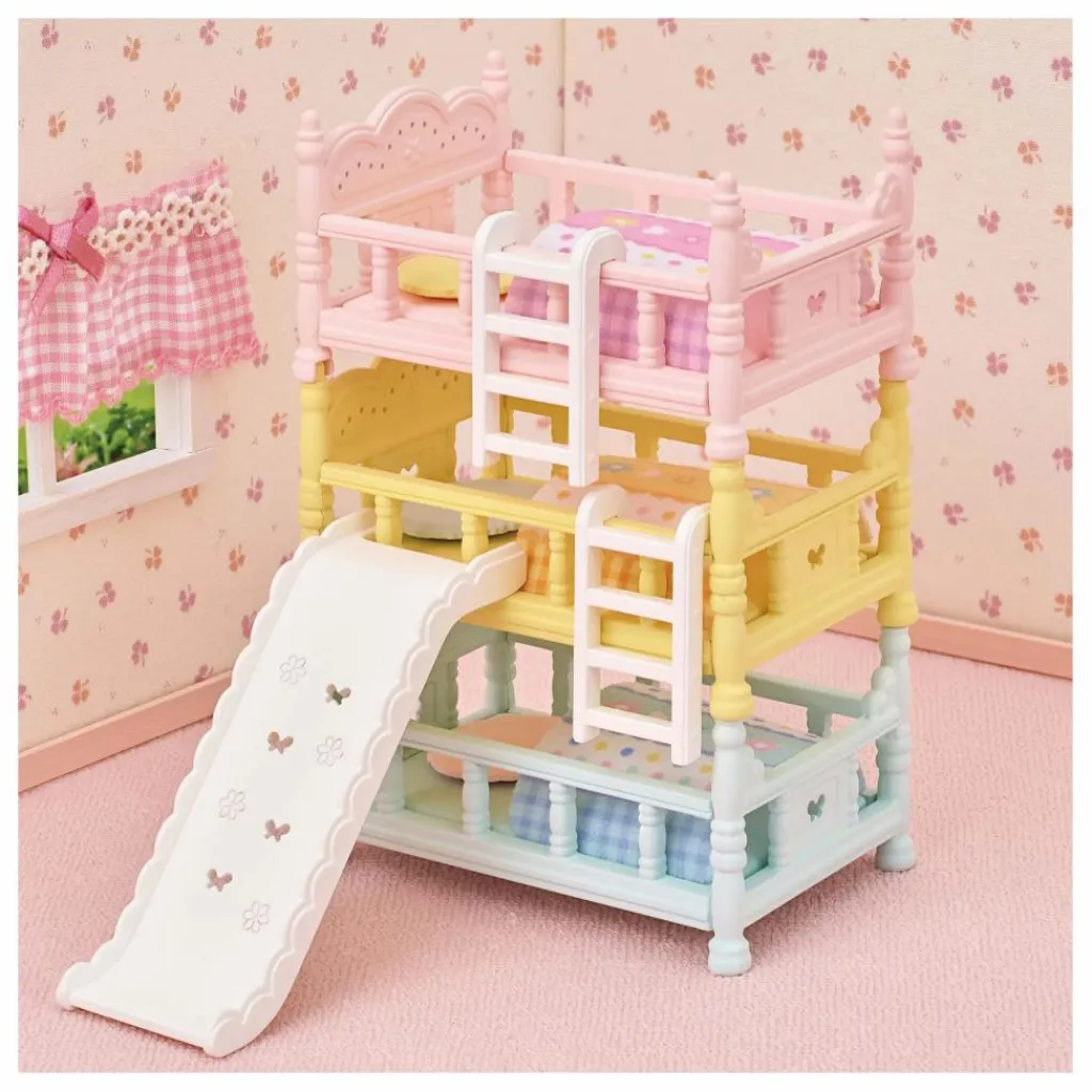 - Les bébés Sylvanian Families adorent leurs lits superposés colorés ! Ce set comprend trois lits à barreaux aux détails soignés (un bleu, un jaune et un rose) avec des ensembles oreiller/couverture assortis. Il inclut aussi deux échelles amovibles et un toboggan. Les enfants dès 3 ans peuvent arranger les lits, les échelles et le toboggan à leur guise pour que les bébés Sylvanian passent une nuit parfaite et se réveillent en pleine forme. De plus, ils s’amuseront à les faire descendre du lit par le toboggan !