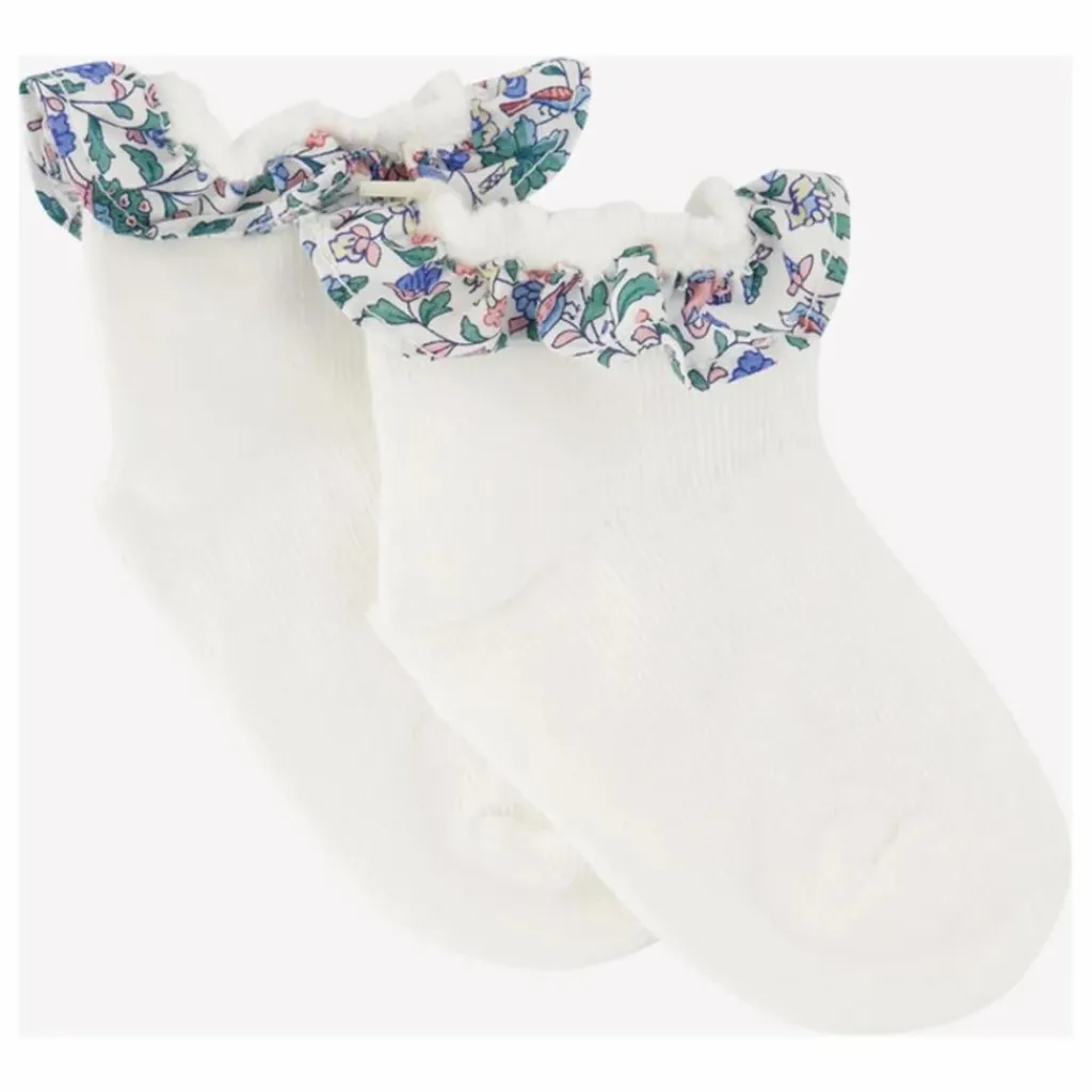 - Ces chaussettes écru aux finitions volants en couleur marine apportent une touche de charme au thème « baby country club ». Confectionnées en tissu liberty en coton, elles allient douceur et style pour les petites filles. Idéales pour compléter une tenue élégante, ces chaussettes sont idéales pour un look raffiné et confortable.