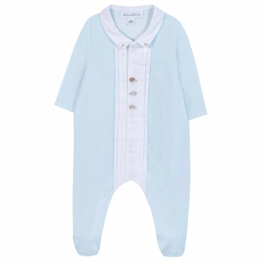 - Ce pyjama bleu ciel pour bébé garçon allie élégance et douceur. Les plis religieux soulignent délicatement le devant, tandis que de petits hérissons brodés apportent une touche charmante. Le col pointu est orné d’une broderie TC, pour une finition raffinée. Un modèle pensé pour les premiers instants avec délicatesse.