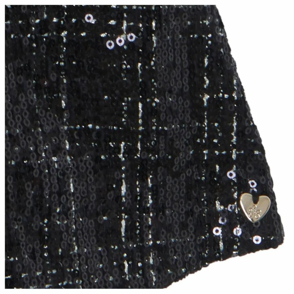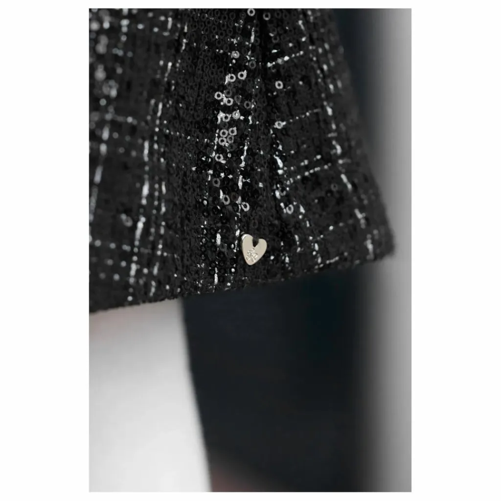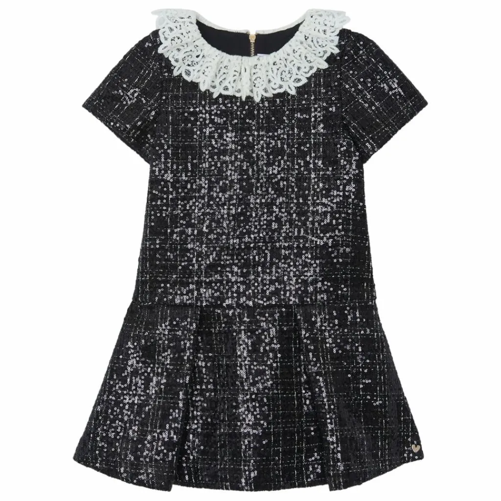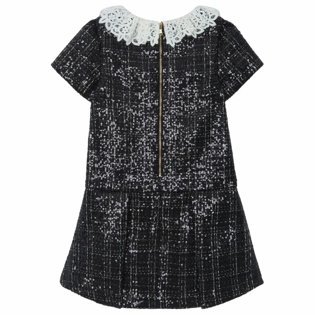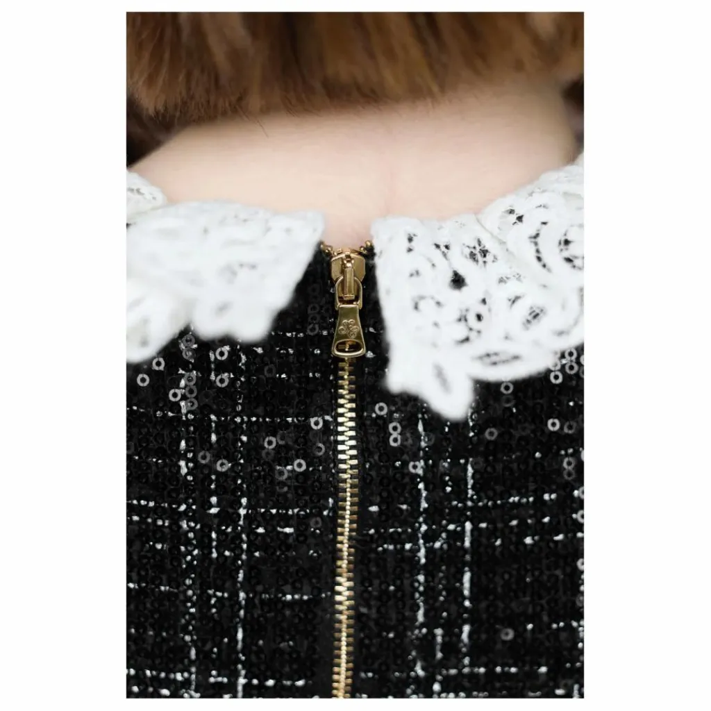 - Cette robe pour junior fille, en noir élégant et confectionnée en tweed, se distingue par son col volanté en dentelle, qui apporte une touche raffinée et délicate. Les manches courtes offrent un équilibre parfait entre confort et style. Idéale pour des occasions spéciales, cette robe combine sophistication et praticité,