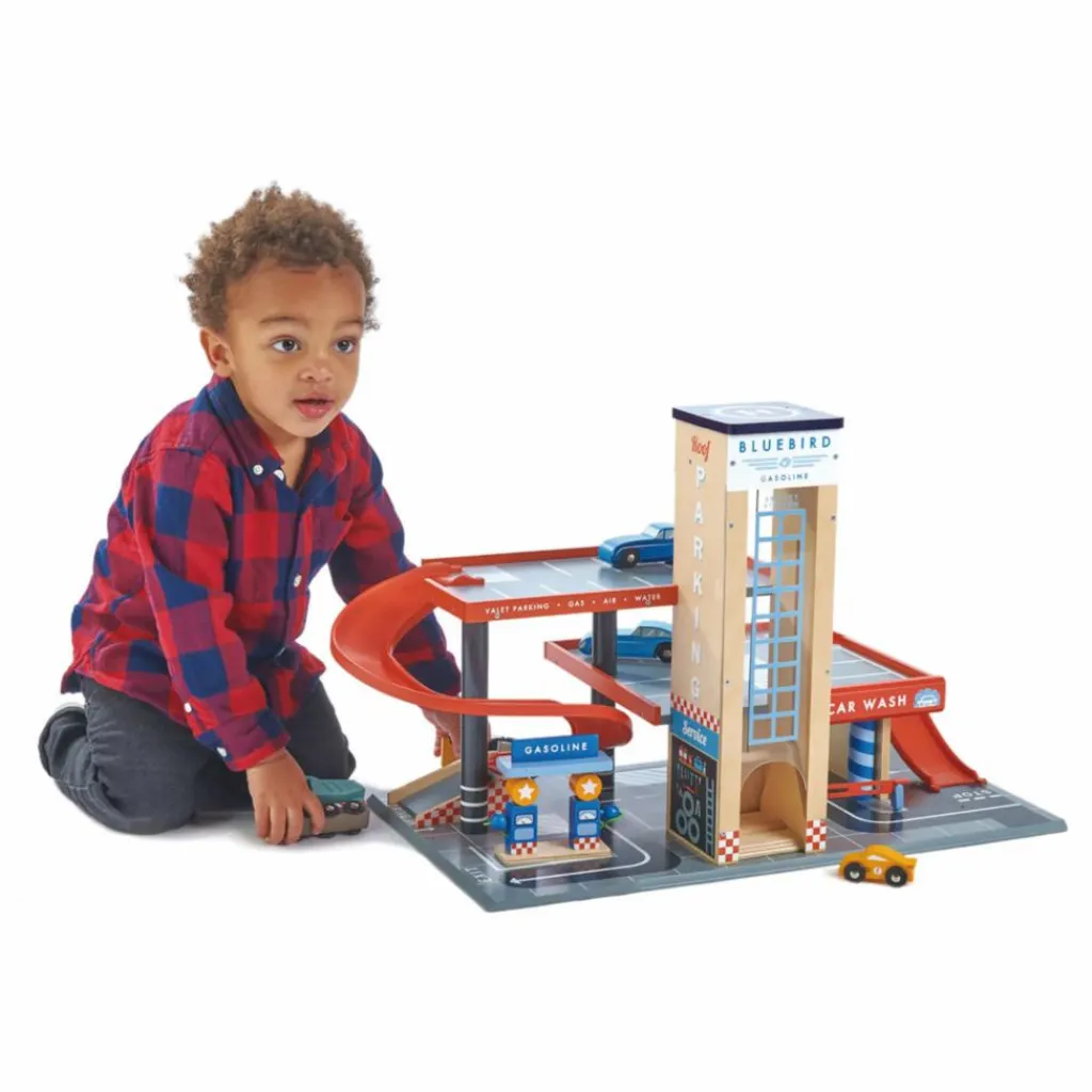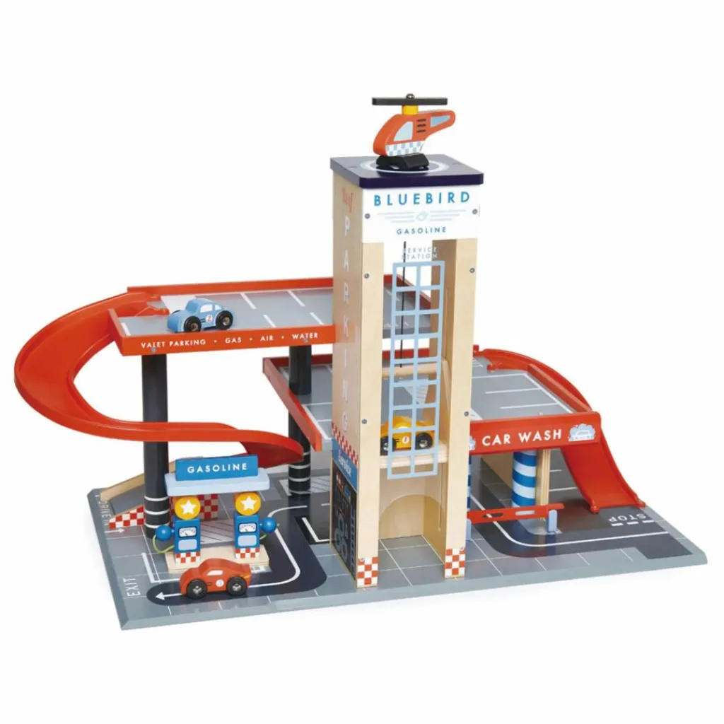 Ce garage / station-service offre un multitude d’interactions de jeux avec le panneau central unique, les deux rampes, l’ascenseur manuel, les zones de lavage et de stationnement, les pompes à essence, les trois voitures et l’héliport avec son hélicoptère.