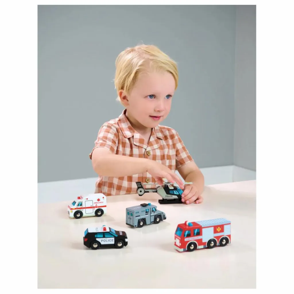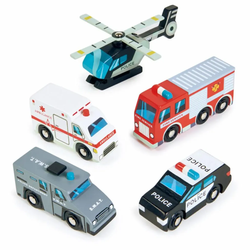 Cet ensemble comprend un hélicoptère avec des pales rotatives, une ambulance, un camion de pompiers, une voiture de police et une voiture SWAT.