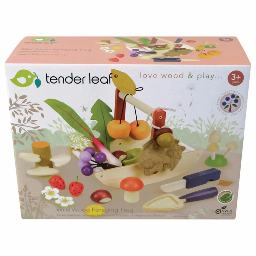 Un trug en tissu et en bois débordant de plantes, de champignons, de fleurs et de baies ramassés. Il comprend un couteau de poche pliable pour couper les branches et une truelle pour chercher des champignons. L’ensemble comprend des trésors populaires et comestibles qui peuvent être cueillis tout au long de l’année dans les forêts et les haies. Le set comprend : 2 pommes de crabe, 2 fraises des bois et 2 fleurs, de l’ail des bois et des fleurs, 3 petits champignons et un cèpe, des prunelles, une feuille et une fleur de pissenlit, 3 champignons d’arbre sur un tronc, une châtaigne et un gland avec des feuilles. Comprend un livret de recettes dépliable avec 8 recettes correspondant au contenu du trug. Idéal pour jouer à faire semblant. Bon pour les compétences sociales et linguistiques.