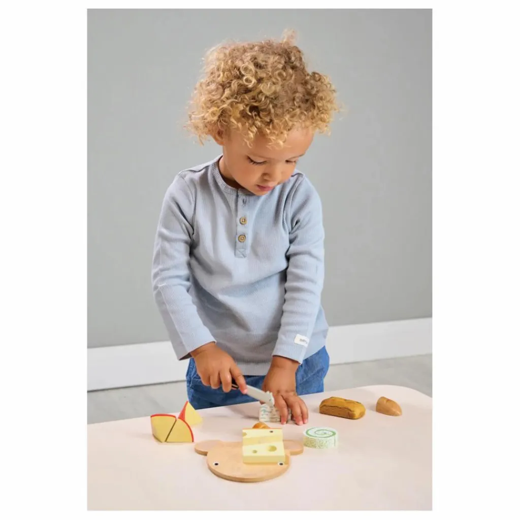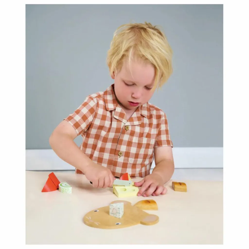 - 1 plateau à fromage en bois en forme de souris, 1 couteau à fromage souris, 1 baguette en 3 parts, 1 edam en 3 parts, 1 gruyère, 1 fromage rond, 1 bleu en 2 parts, 1 sac en filet pour le rangement