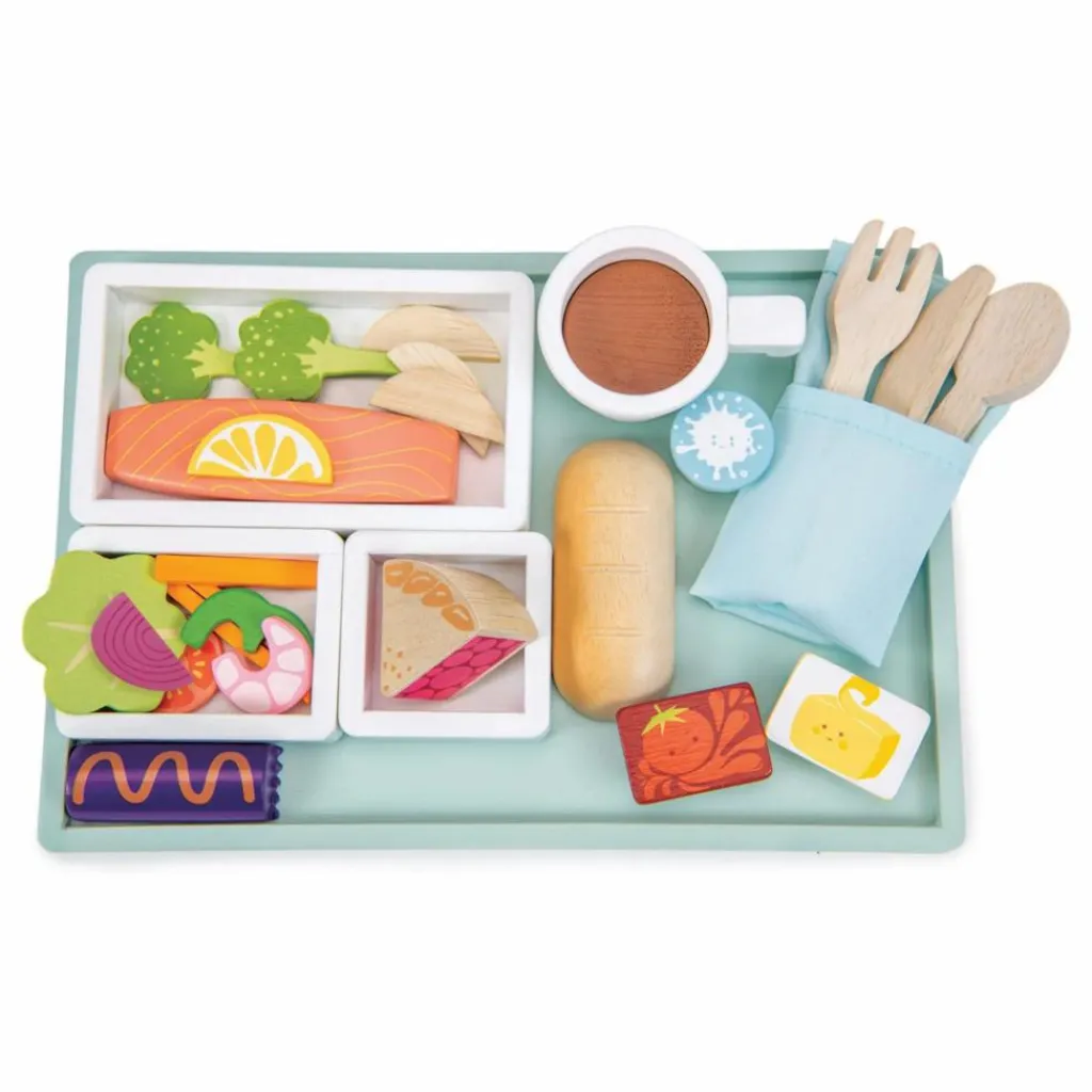 Les repas en altitude n’ont jamais eu l’air aussi bons ! Un plateau repas de la compagnie aérienne avec 3 plats, un petit pain et des couverts ! Une salade de crevettes avec des bâtonnets de carottes pour commencer, suivie par du saumon, des brocolis et des pommes de terre, et pour finir une délicieuse tarte aux cerises ! Une tasse de thé bien remplie et un chocolat en fin de repas font de ce repas un vrai régal. N’oubliez pas le mini-beurre de restauration, la sauce tomate et le lait pour le thé ! Un passeport pour enfants est inclus pour la suite des aventures. Bon pour jouer à faire semblant. Bon pour les compétences sociales et linguistiques.