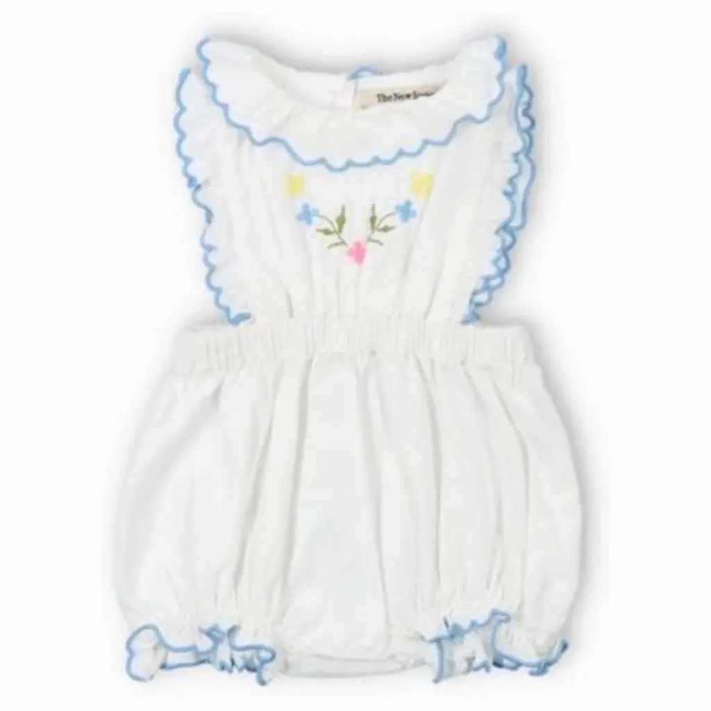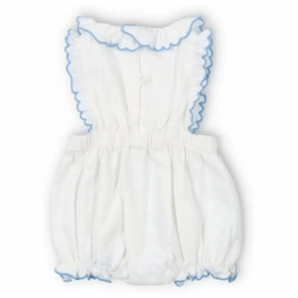 - Barboteuse Hermione Baby en tissu baize 100 % coton blanc avec broderie de fleurs. Collier avec encolure froncée et broderie bleu poudre, volants avec broderie et ceinture élastique.