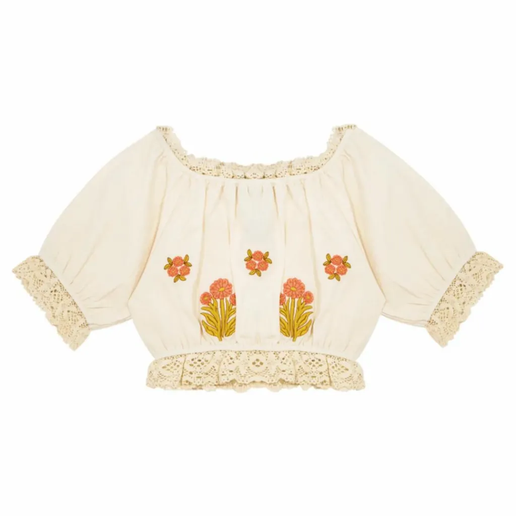 - Logo sur la manche, Encolure carrée, Manches courtes, Bords volantés, Plissé, Broderie(s)