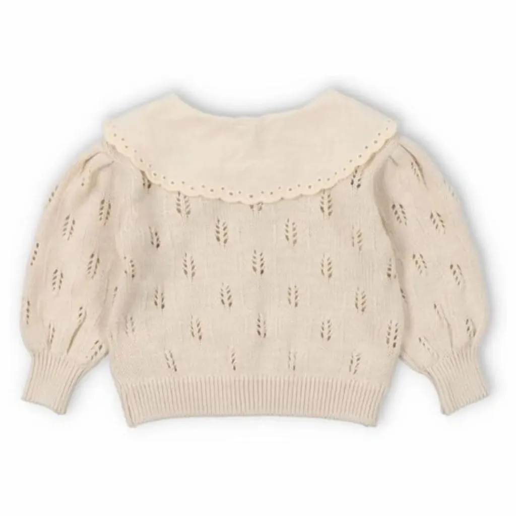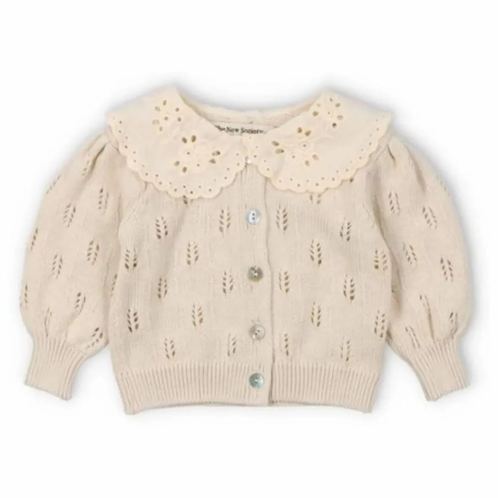 - Cardigan en tricot avec structure, boutons en nacre, poignets et ourlets côtelés. Le col est orné d’une délicate dentelle contrastée. Peut être associé au bloomer assorti.