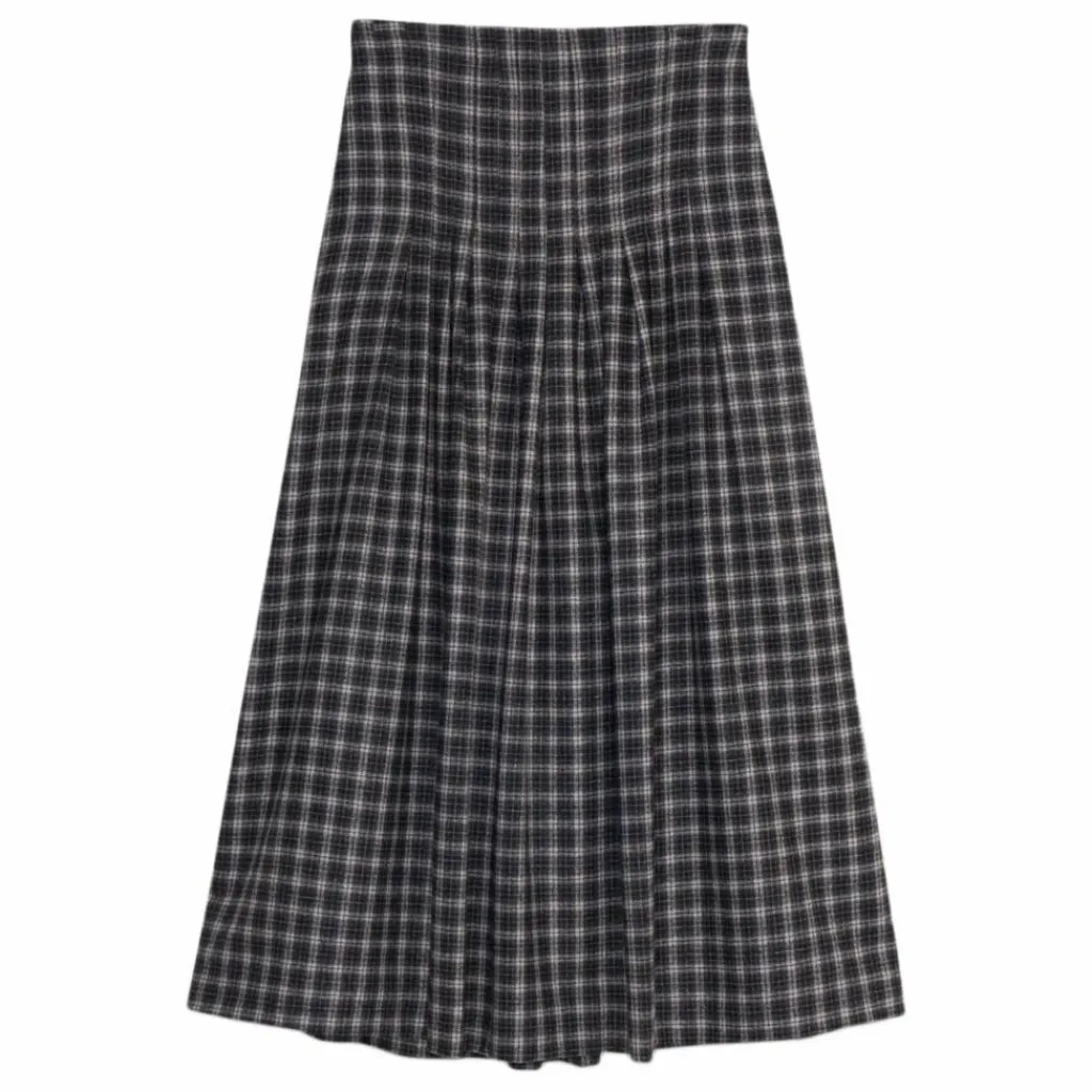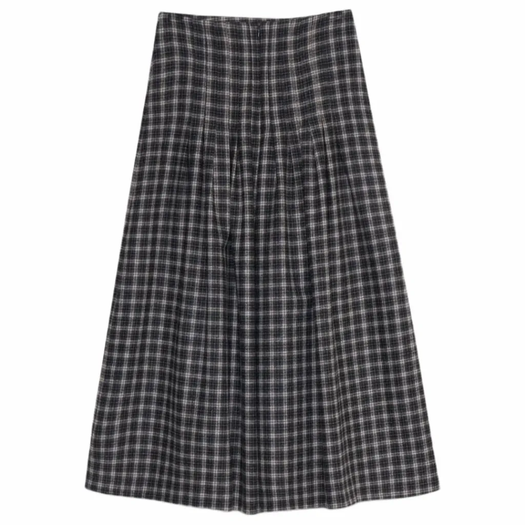 - Jupe mi-longue en laine écossaise avec plis surpiqués sur le dessus. Fermeture éclair sur le côté.
