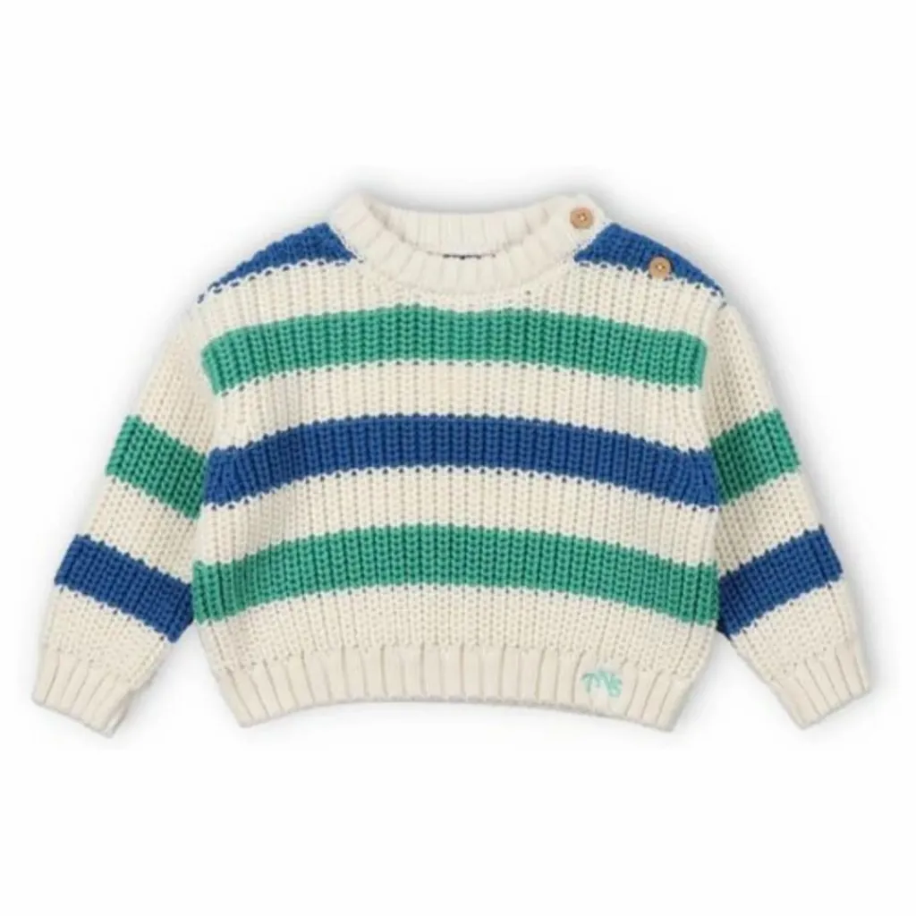 - L’un de nos meilleurs vendeurs, le pull Leto, avec ses rayures colorées et sa maille côtelée. Il a une encolure, des poignets et un ourlet côtelés, et une ouverture aux épaules avec des boutons en bois.