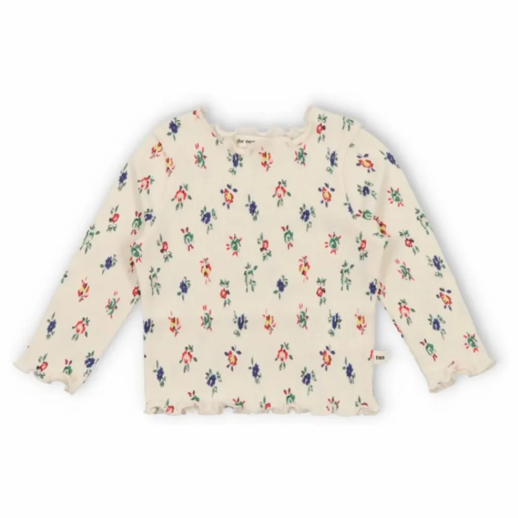 - T-shirt à manches longues en côtes, imprimé de fleurs de vanille, col rond et broderie « TNS » sur la poitrine. Parfait pour combiner avec l’ensemble assorti. Fabriqué avec du coton BCI, une fibre durable garantissant la culture et la traçabilité.