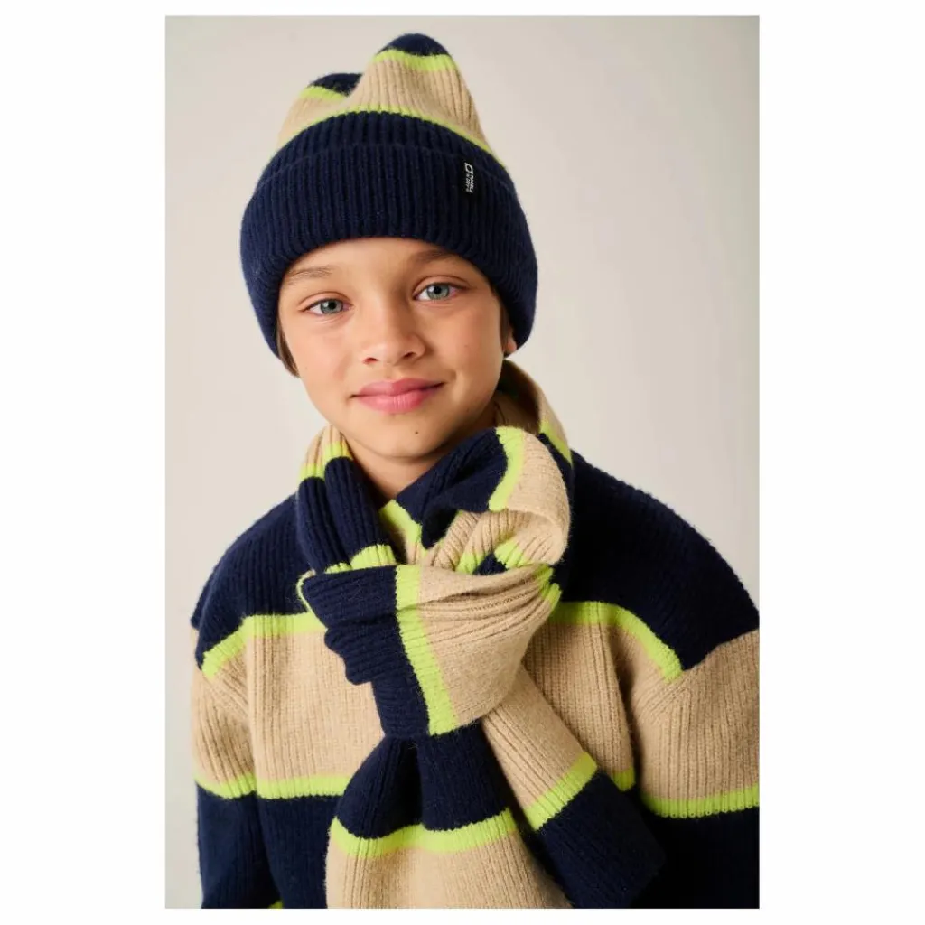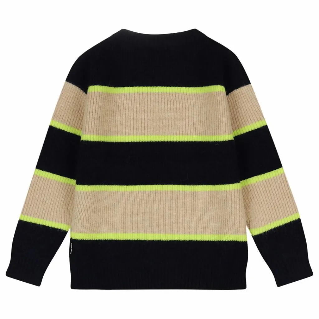 - Ce pull doux en tricot présente un motif à rayures multicolores et des poignets côtelés robustes.