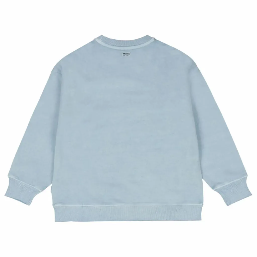 - Ce pull doux et bleu clair est teinté dans la masse, a une coupe surdimensionnée, des poignets côtelés et une broderie sur la poitrine. Le pull est en coton biologique. En raison du lavage spécial, chaque pièce est unique et la couleur du pull peut s’estomper légèrement après un lavage et/ou un port fréquent.