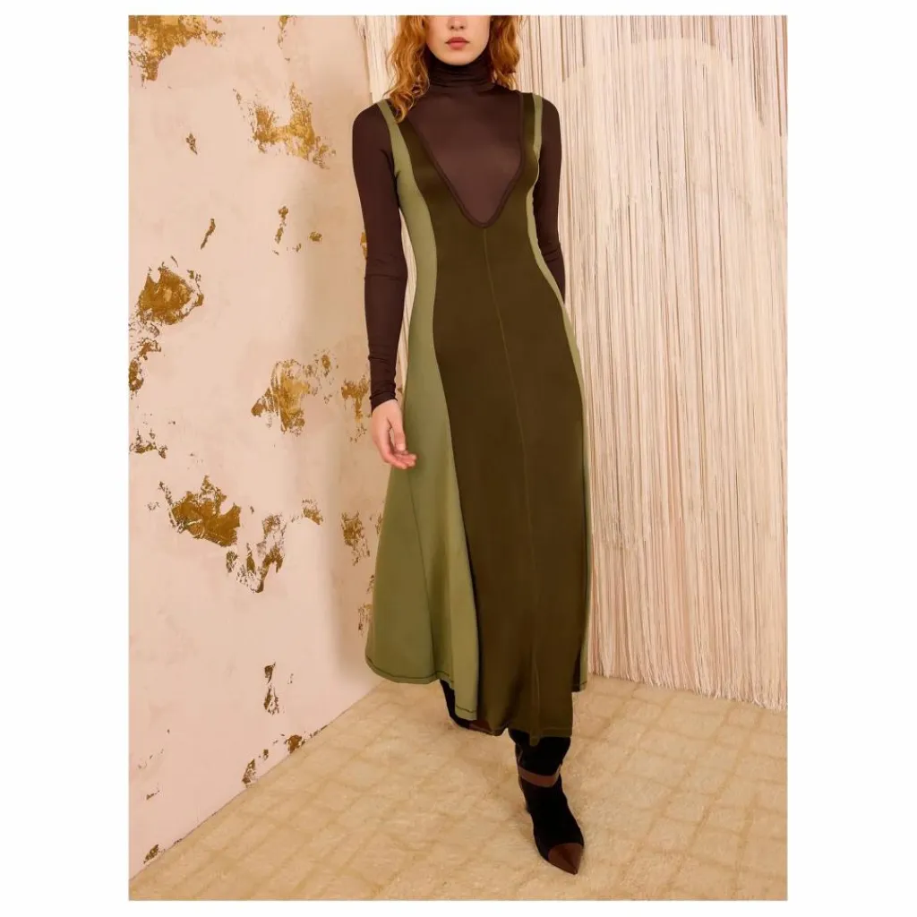 Présentée pour la première fois dans le look 49 du défilé AW25, la robe Nahla affiche une silhouette élégante et un mélange de textures en jersey lisse et côtelé. Cette robe vert foncé à la surface riche est assemblée en patchwork pour créer l’illusion d’un décolleté en V et est finie avec des coutures sportives.