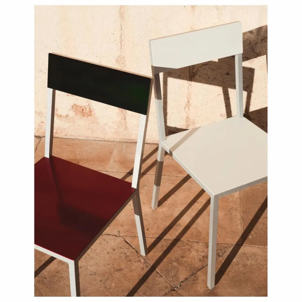 - Le couple de designers renommé Muller Van Severen a conçu sa chaise en alu en 2015 en tant que chaise d’extérieur pour le pavillon Bahreïn d’Anne Holtrop lors de l’exposition universelle de Milan. Depuis, elle est devenue l’un des modèles préférés des architectes et des amateurs de design qui ont un penchant pour le minimalisme ludique. Bien qu’elle ait été conçue à l’origine comme une chaise d’extérieur, nombreux sont ceux qui lui ont déjà trouvé une place à l’intérieur de leur maison. Le succès de cette chaise est dû à sa légèreté et à sa signature typique de Muller Van Severen. Les couleurs soigneusement sélectionnées sont appliquées à l’aide d’une laque protectrice contre les UV, afin de conserver leur éclat. Le cadre en aluminium non revêtu brille merveilleusement au soleil.
