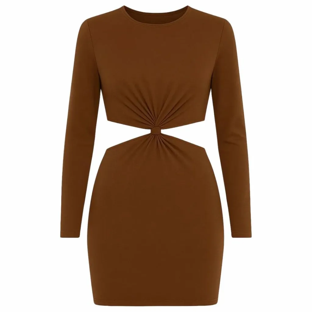 - Mini robe en tissu de bain, avec des découpes à la taille, un col ras du cou et des manches longues.