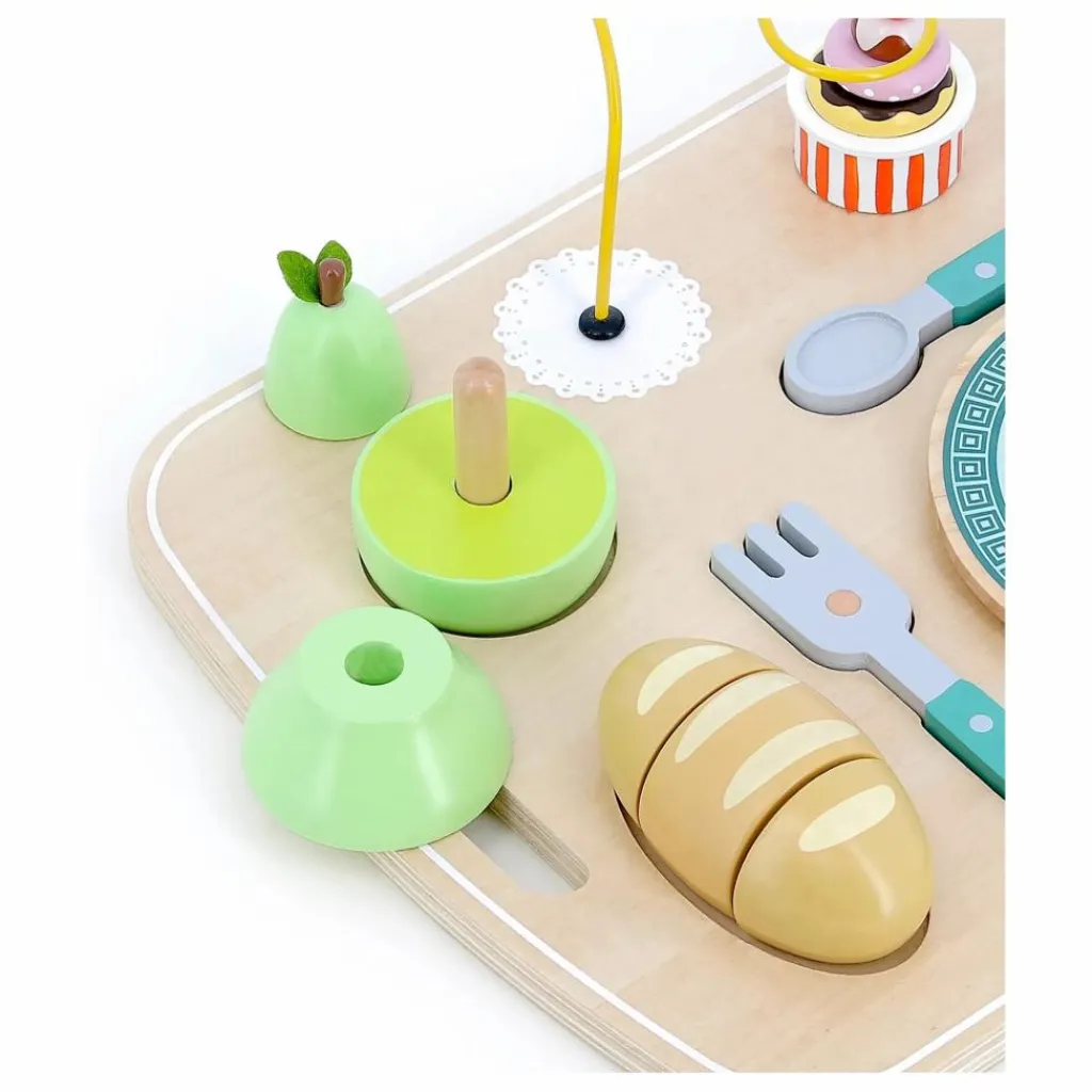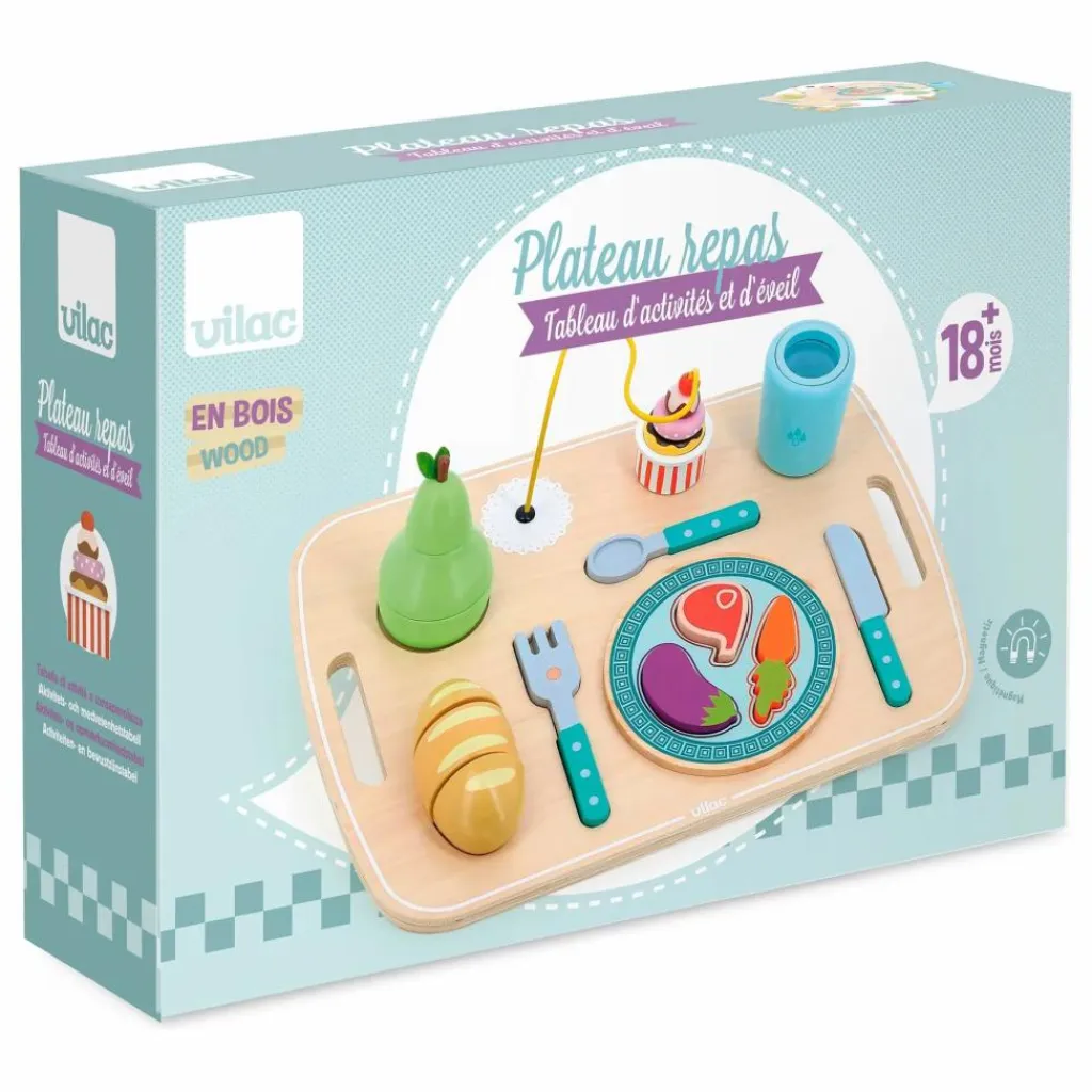- • 1 plateau repas multi-activités en bois.• 1 empilable poire.• 1 pain à scratcher.• 1 pot de glace jouet à fil.• 1 verre d’eau hochet.• Couverts et assiettes à encastrer.• 3 aliments à encastrer dans l’assiette.