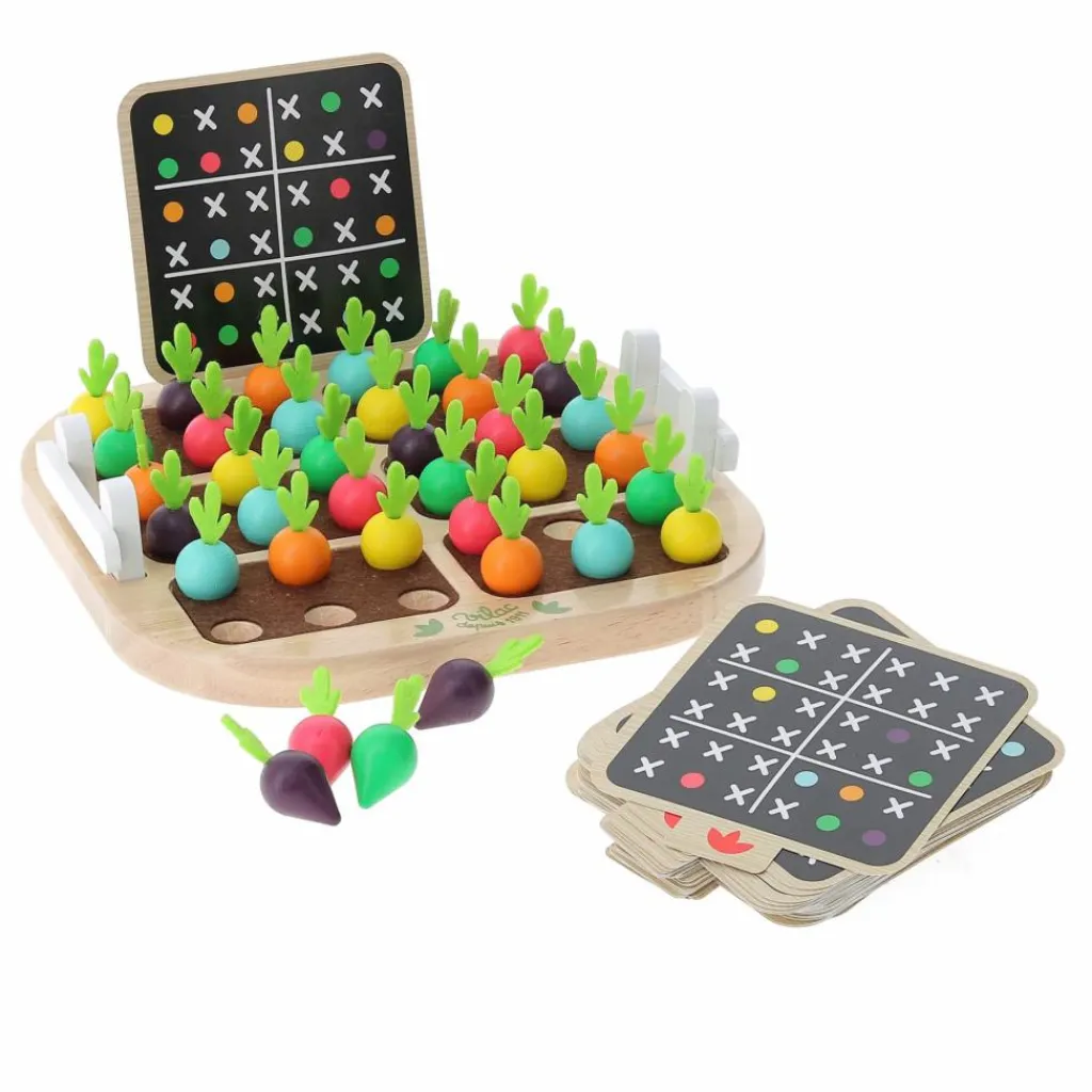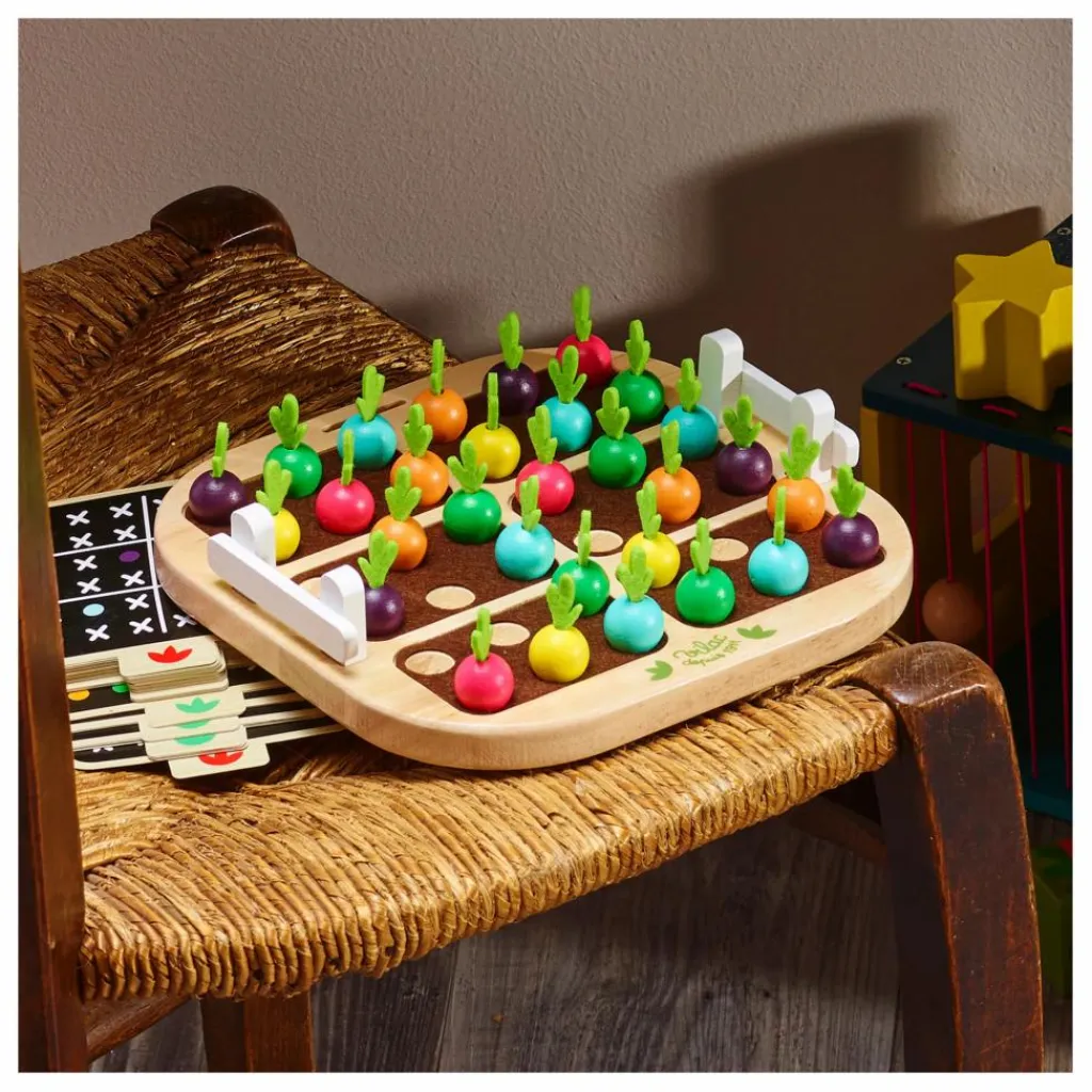 Vilac revisite le jeu du sudoku pour l’adapter aux plus jeunes. Le but du jeu est simple : il faut positionner les légumes en bois dans le potager comme la carte modèle puis compléter les cases vides. Il faut retrouver une seule couleur de légume dans un carré potager mais également en alignement vertical et horizontal.
