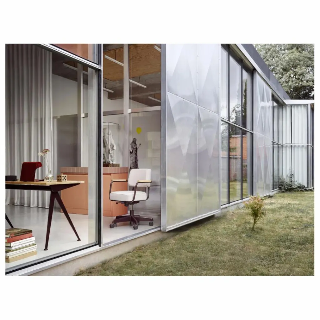 Crée en 1951 par le designer Jean Prouvé, le Fauteuil Direction Pivotant conserve une esthétique intemporelle, grâce à ses lignes modernes et ses exigences fonctionnelles. L‘assise et le coussin de dossier volumineux reposent sur un cadre élégant, tandis que les accoudoirs en bois confèrent au siège de bureau une note de confort familier.