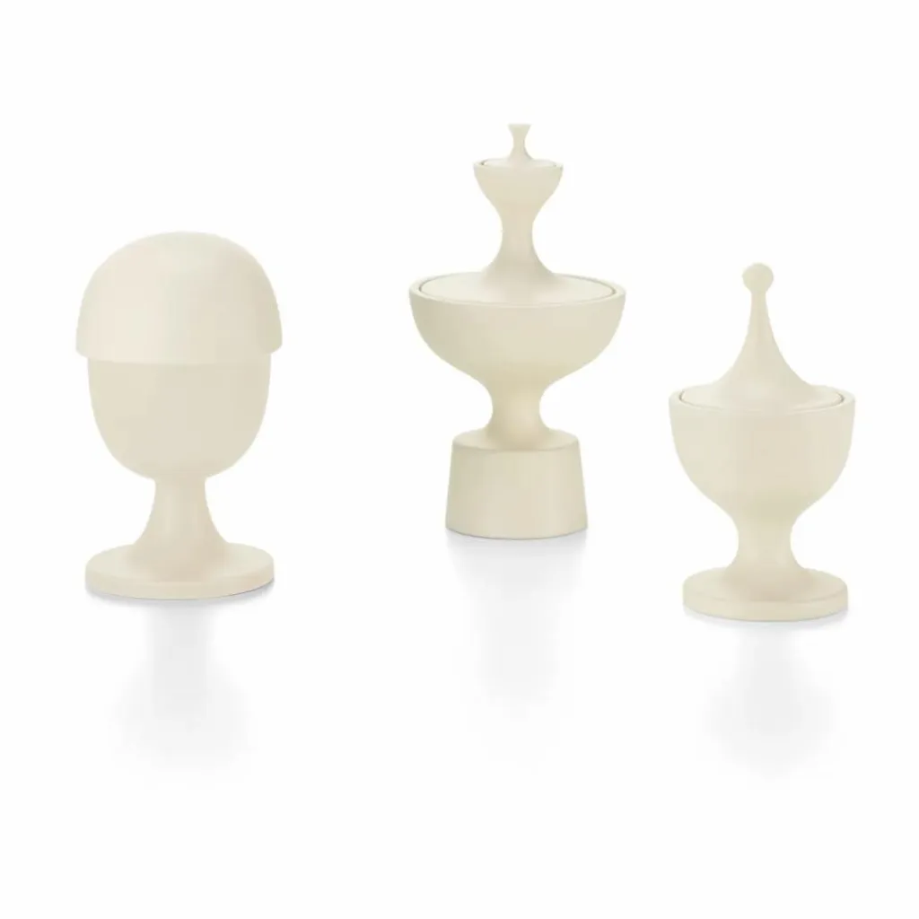 - Alexander Girard a apporté au design du XXe siècle une dimension séduisante et ludique qui manquait à l’esthétique austère du modernisme classique. Celle-ci trouve toute son expression dans les Ceramic Containers. Le modèle original de ce pot a été réalisé en bois, tourné à la main par Girard sur un tour dans son atelier. Leurs silhouettes rappellent les formes des vases de pharmacie traditionnels, des pièces de jeux de société ou des outils de chapelier. Sur la base de ces modèles, Vitra a développé ces superbes pots en céramique moulée, le matériau naturel leur conférant un aspect artisanal. Teints à la main dans des nuances appartenant à la riche palette de couleurs de Girard, ces récipients conviennent au rangement de bricoles, de clés, de pièces de monnaie ou d’autres objets.