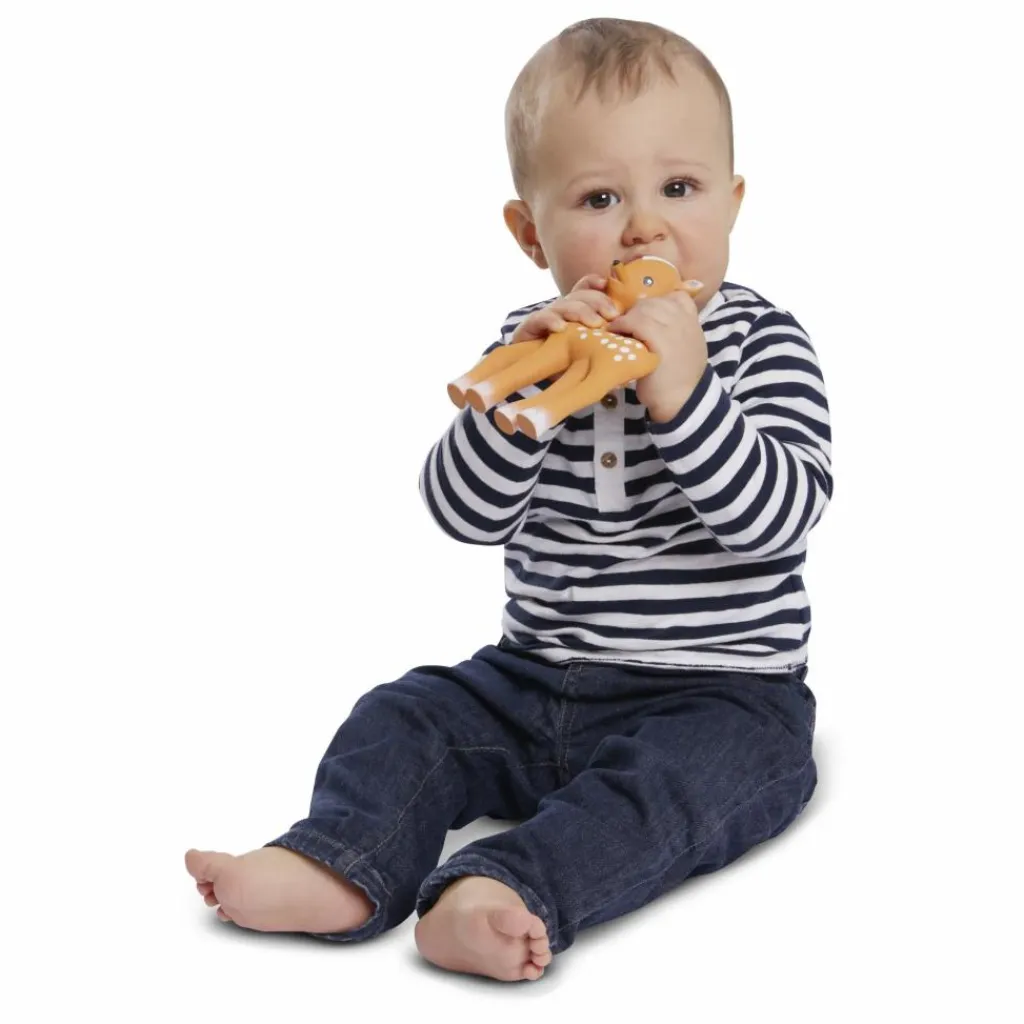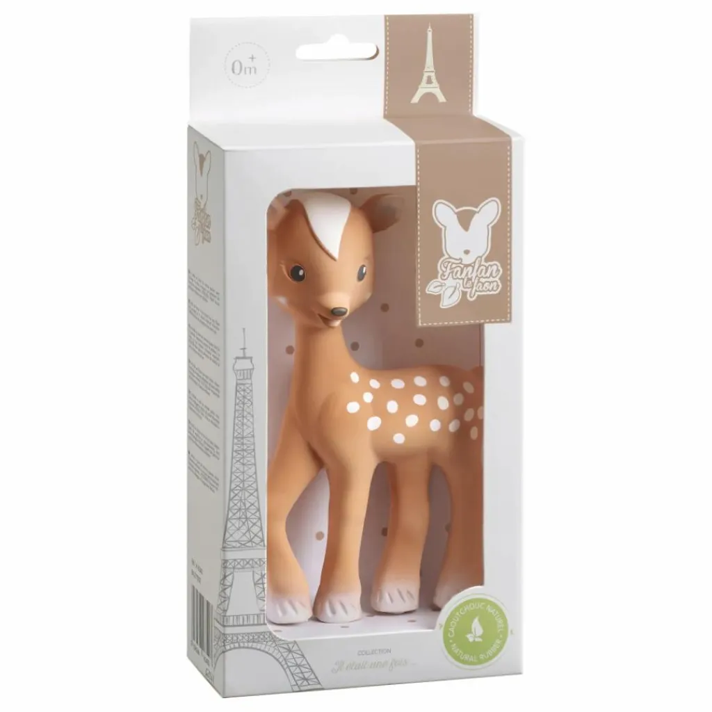 Fanfan le faon est le premier faon fabriqué à base de base de caoutchouc 100% naturel. Il éveillera les sens de votre bébé : la vue, il attire l’œil de bébé avec ses taches colorées, l’ouïe, avec son sifflet il l’amusera, le goût, à mettre dans la bouche il soulagera aussi les gencives de bébé lors de poussées dentaires, le toucher, léger et maniable, et l’odorat, son doux parfum d’hévéa naturel le rendra reconnaissable au milieu de tous.