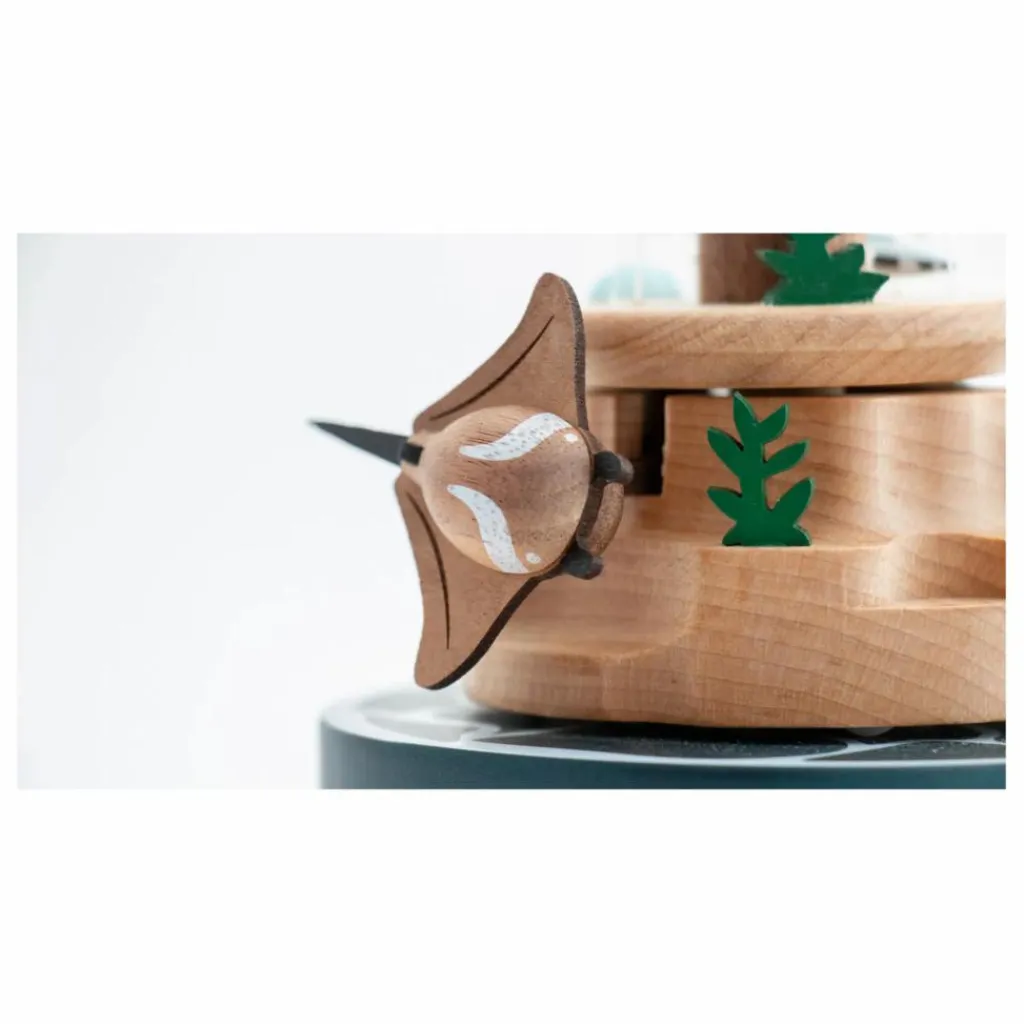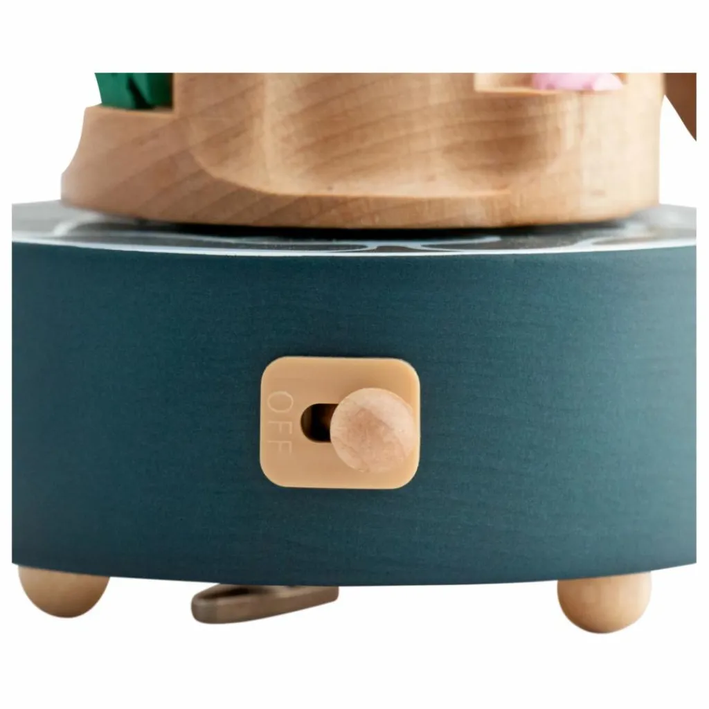 Cette boîte à musique a entièrement été réalisée en bois issu de forêts durables d’Europe, des États-Unis, du Canada et de Nouvelle Zélande. Le mouvement, créé à la main, est hérité du savoir-faire ancestral d’une manufacture japonaise. À remonter manuellement, elle joue une mélodie pendant une centaine de secondes, et livre le spectacle de son décor en mouvement.