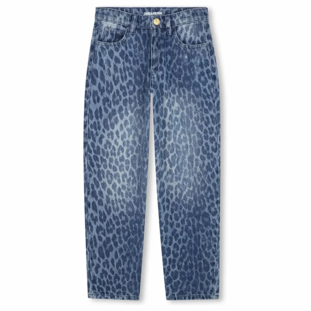 - Jean imprimé léopard, coupe large, taille normale, étiquette sur ceinture dos.